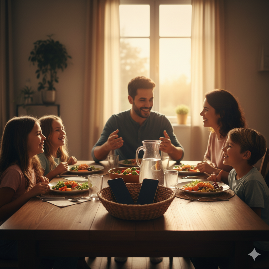 The family meal is perhaps the most important opportunity for daily connection and communication. It’s where stories are shared and relationships are nourished. A phone at the table is a wall between participants.